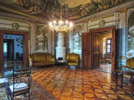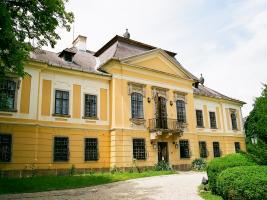 Az utcától kovácsoltvas kapu választja el, a kapu egyik oszlopán az Almásyak címerét tartó unikornis (egyszarvú paripa) áll. A főépület tengelyében háromablakos, díszes középrész látható, földszintjén szerény bejárati ajtóval, felette erkéllyel. A bejárati ajtó mögött a sala terrena (hűsölő) húzódik, a lapos fiókos dongával fedett tér festése (farács, növények, ajtó stb.) lugasra emlékeztet, távolban feltűnik a versailles-i kastély perspektivikus architektúrája, emlékeztetve arra, hogy a megrendelő francia származású volt. A földszinti előtérből nyílik a kápolna, amelyet 1802-ben alakítottak ki, illetve rendeztek be, eredetileg a család tagjai számára, de idejárt a falu kevés számú katolikusa is. Az előtérből elegáns kétkarú lépcsőn át az emeletre jutunk. Innen a park felé nyíló ajtó az épülettel három oldalról körülhatárolt barokk udvarra vezet. Az emeleti előtér mennyezetét freskó díszíti, amely Auróra diadalmenetét ábrázolja, Kracker János Lukács művész festette 1778-ban. Az oldalfalakat római istenségek szoborszerű karikatúrái, gúnyképei díszítik, Venus, Apolló, Diana, Mars, Euterpe, Merkur építészeti formákba kényszerített figurái láthatók. A művész franciametszeteket használt előképnek, ezek jellegzetessége volt a mitológiát kigúnyoló, racionalista felfogás.
